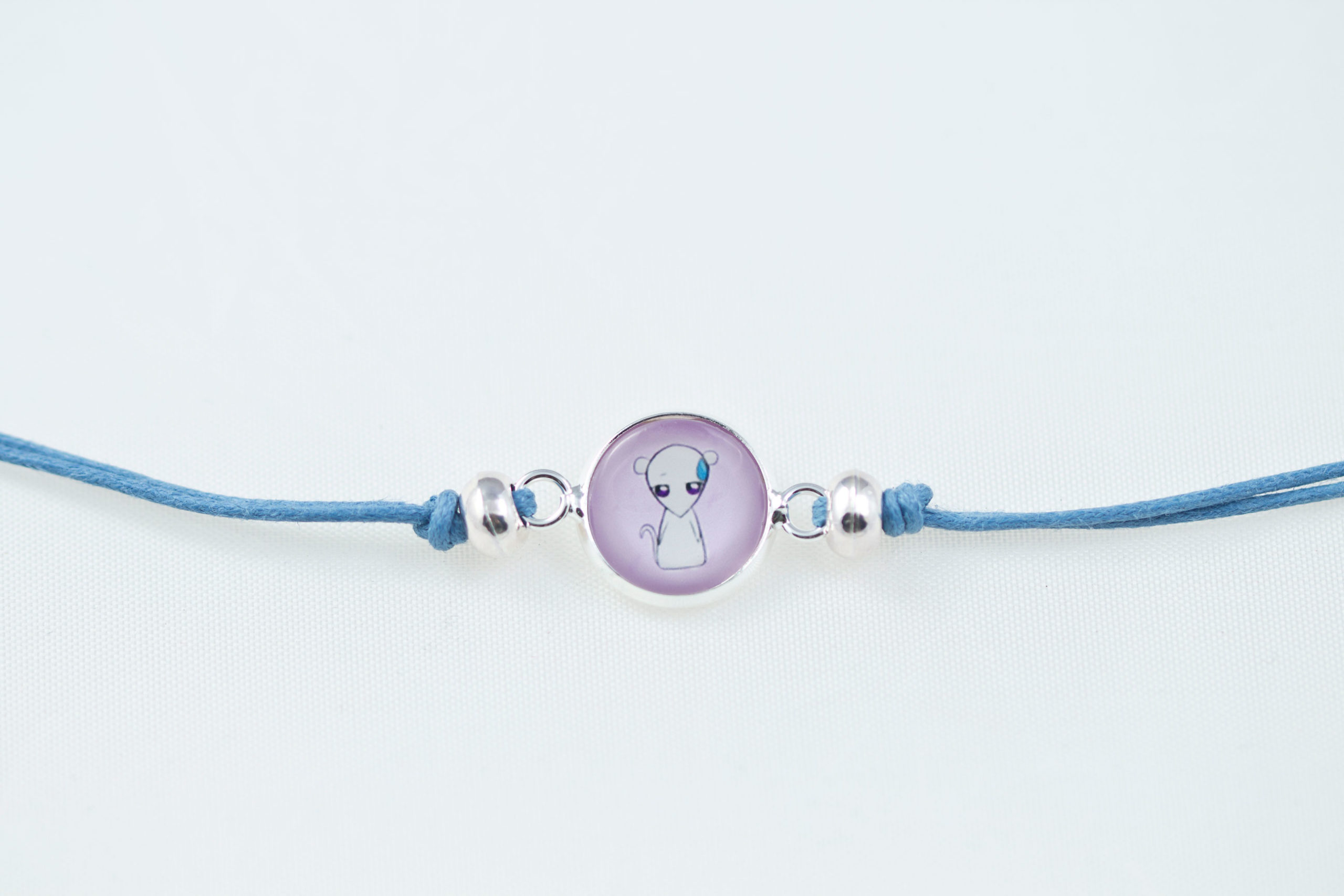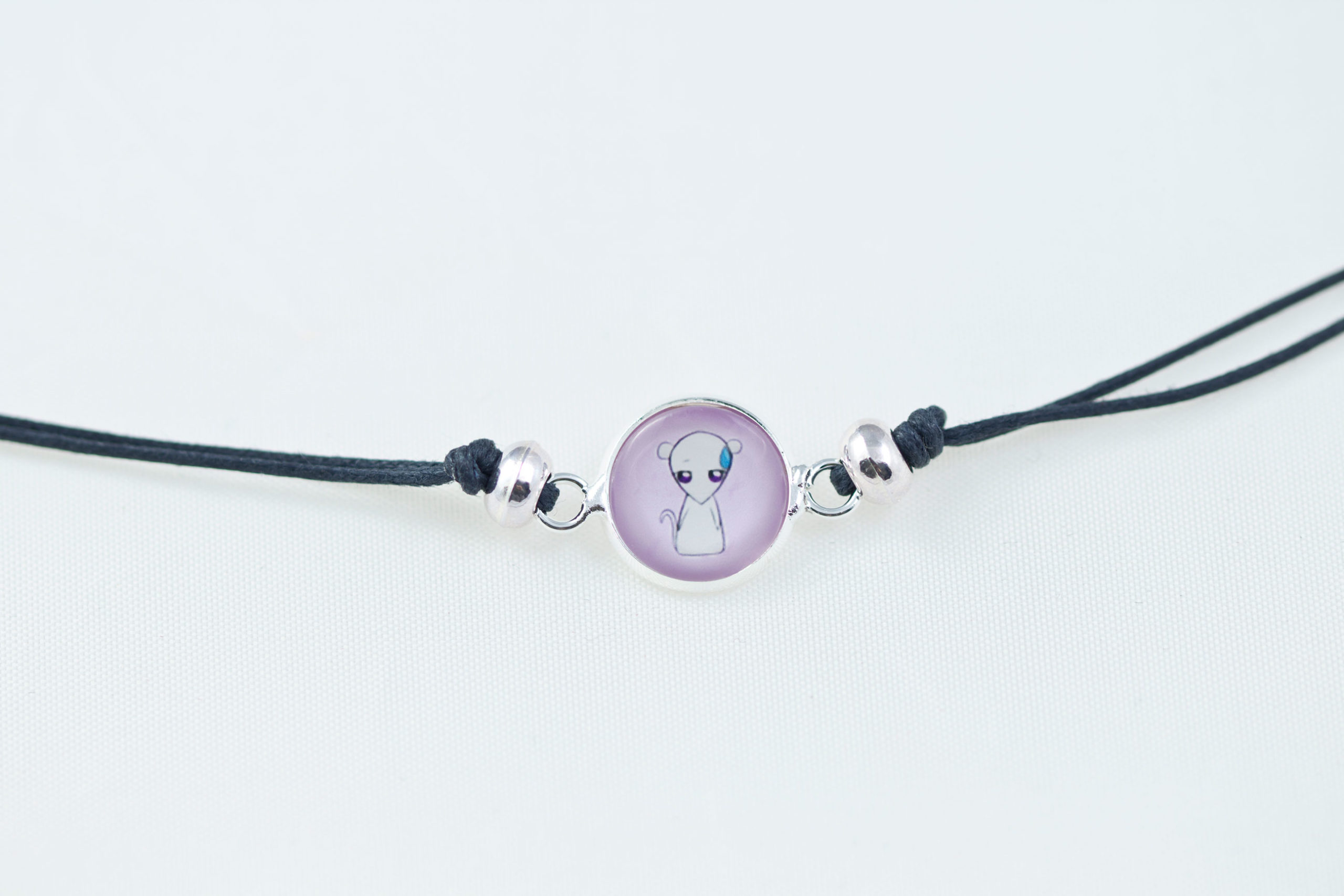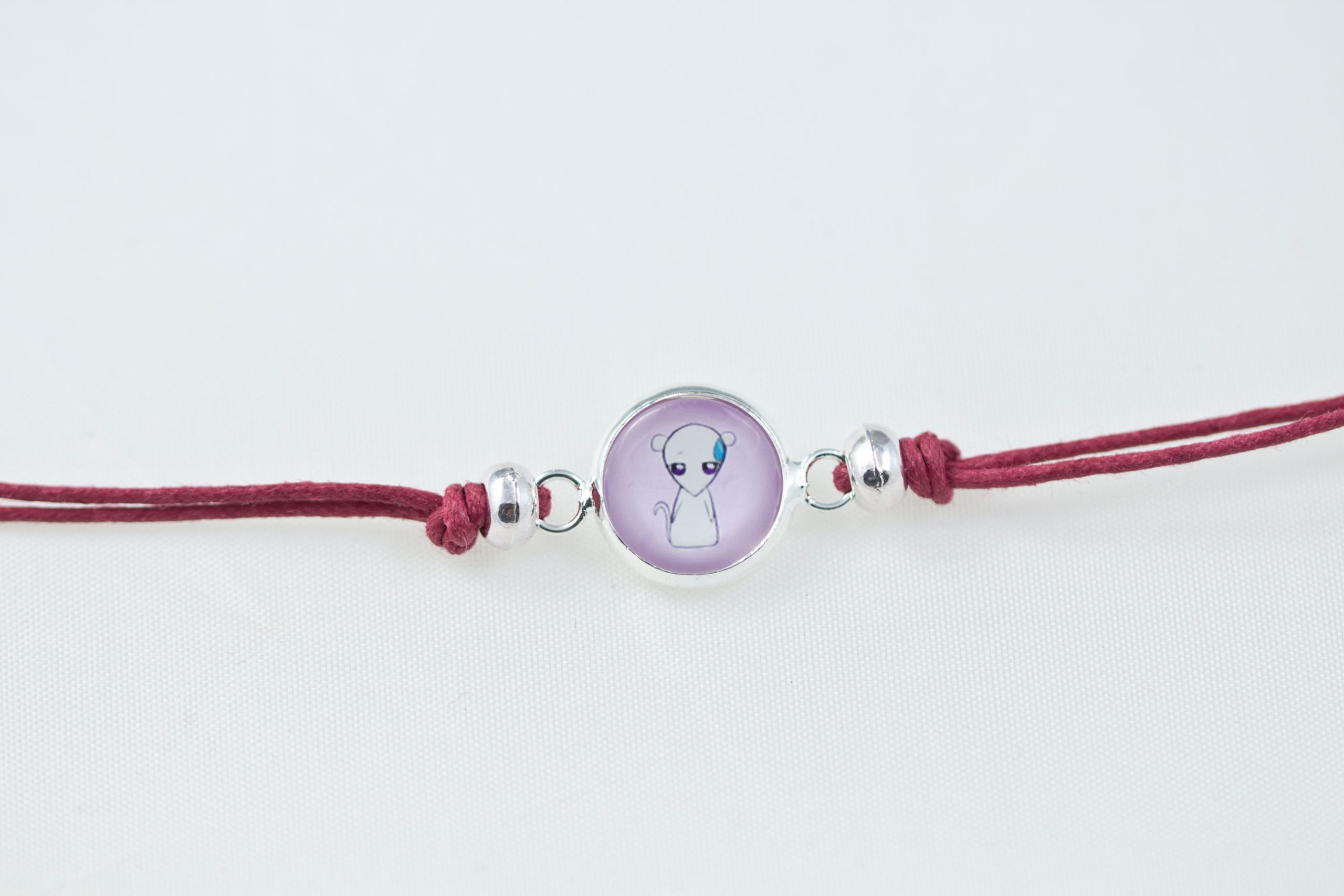 Adjustable waxed cotton bracelet and metallic beads with Yuki figure in center button under magnifying glass dome.