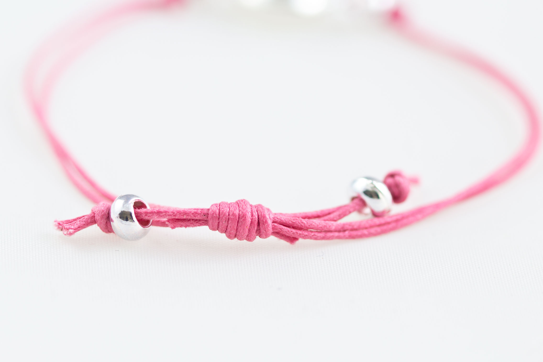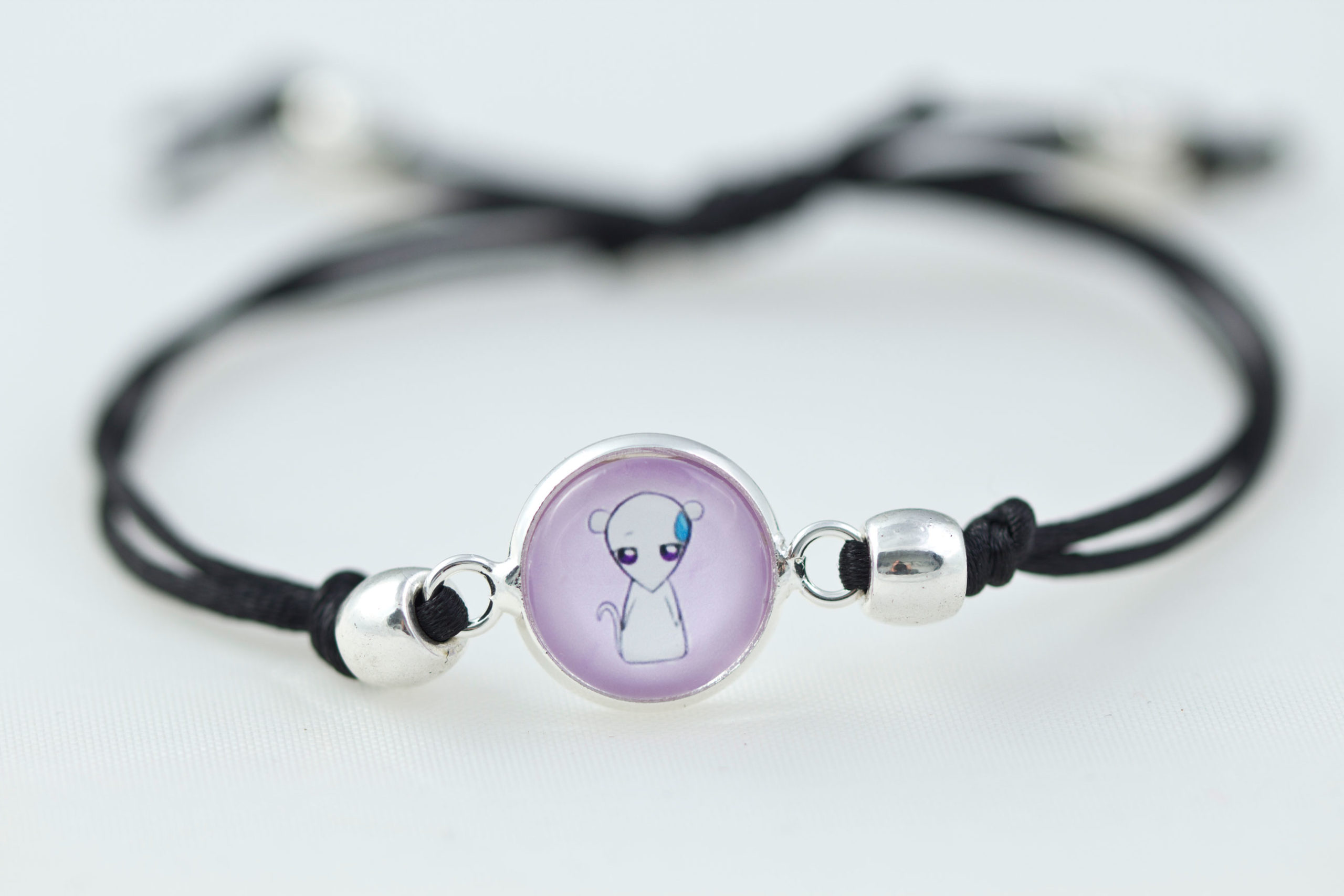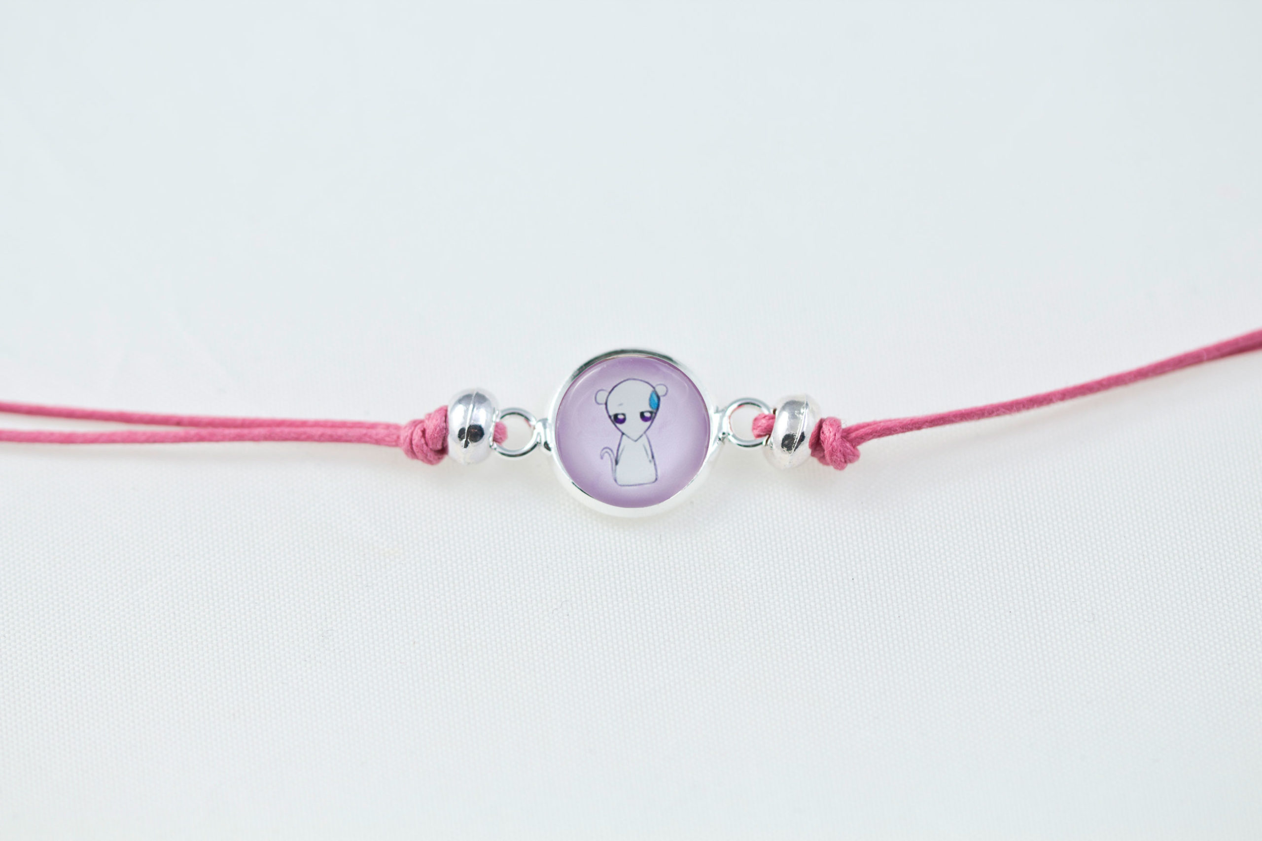 Adjustable waxed cotton bracelet and metallic beads with Yuki figure in center button under magnifying glass dome.