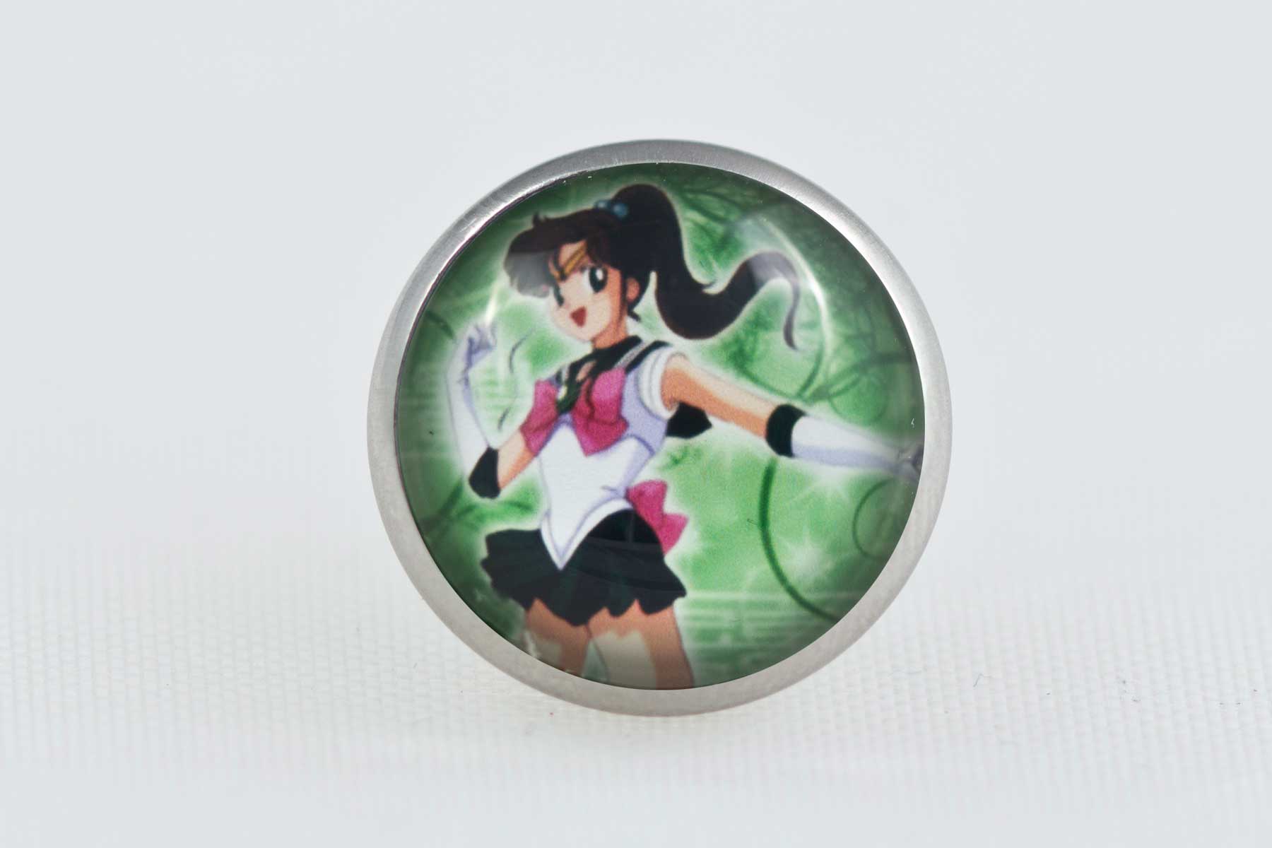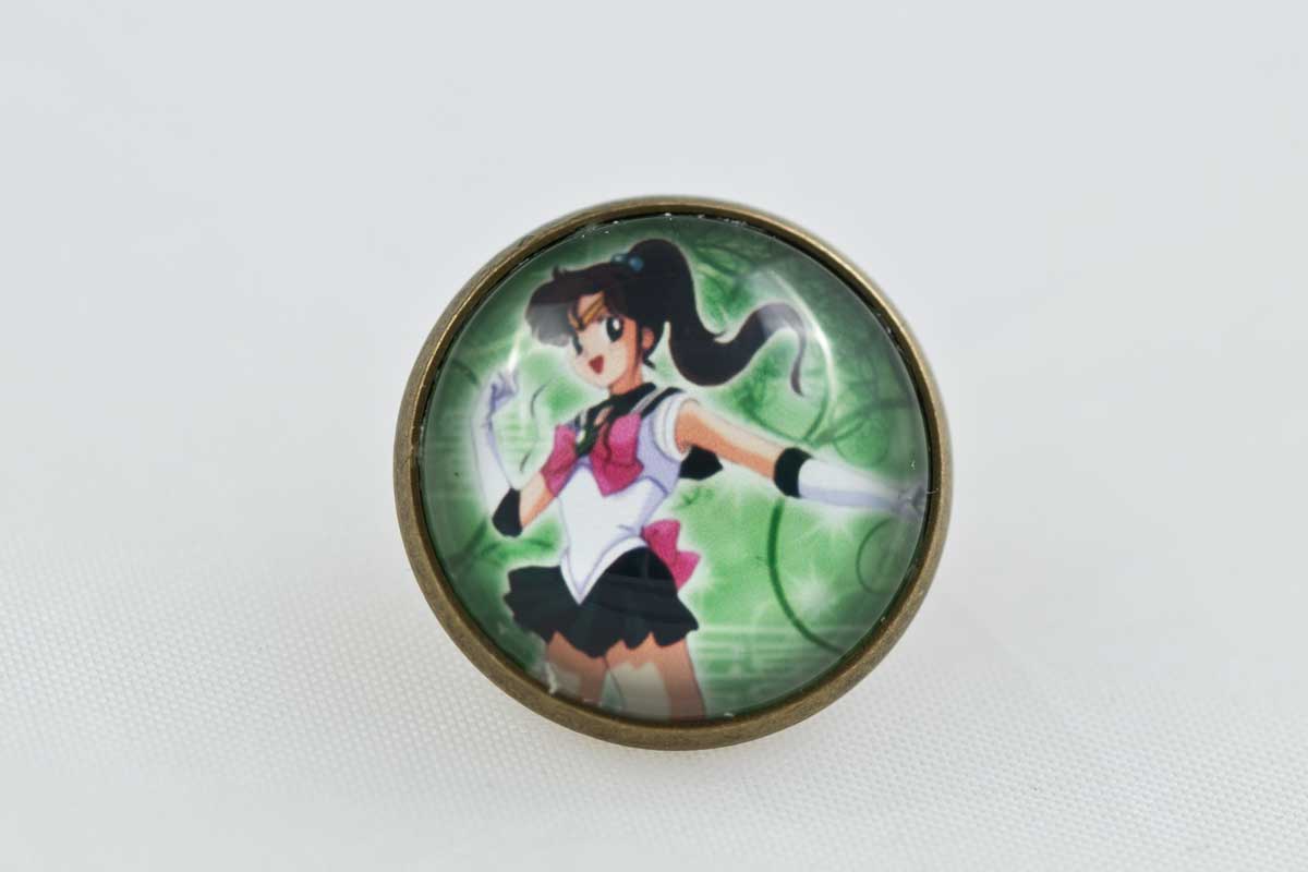 1 Pc butterfly tie pin with a cute Sailor Jupiter figure under a magnifying glass dome.